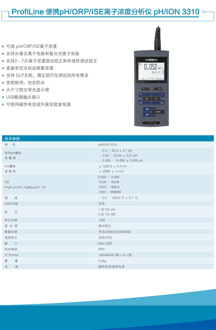 德國(guó)WTW pH/ION 3310便攜式離子濃度測(cè)試儀,可測(cè)pH/ORP/ISE離子濃度;支持分離式離子電極和復(fù)合式離子電極;支持2-7點(diǎn)離子濃度測(cè)試校正和非線性測(cè)試校正。