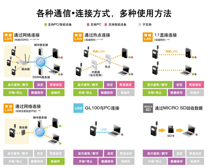 ·設(shè)定網(wǎng)絡(luò) (GL100-Network_Config 使用PC應(yīng)用程序)無(wú)線(xiàn)LAN ·讀測(cè)量數(shù)據(jù)、主機(jī)設(shè)定 (使用PC應(yīng)用程序)
