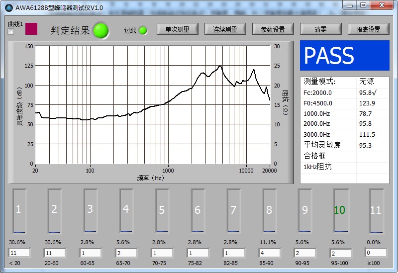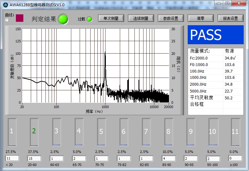 蜂鳴器測試儀是專用于蜂鳴器電聲特性測試的儀器。測試儀可以測試包括有源(包括電磁式和壓電式)和無源(包括電磁式和壓電式)兩種類型的蜂鳴器電聲指標。有源蜂鳴器通過輸入蜂鳴器的直流電壓,并選擇輸出方式,在主界面上會顯示在一段頻率范圍內(nèi)的頻譜曲線,同時在右邊的結果顯示框中顯示最高點的頻率及靈敏度級,蜂鳴器出廠的額定頻率及對應的靈敏度級(頻率可以在參數(shù)設置界面自行輸入)。無源蜂鳴器通過輸入信號幅度,并可以自定義輸出的頻率范圍,在所定義的頻率范圍內(nèi)輸出頻響曲線。同時可以顯示平均靈敏度,諧波失真,阻抗及曲線最高點的頻率及相對應的靈敏度級,同時還可以顯示出廠額定頻率及對應的靈敏度級。測試結束后,根據(jù)自定義的標準,簡潔直觀的顯示 PASS/FAIL,自動判斷是否合格??梢院妥詣臃诌x機臺配合使用,自動判斷是否合格,進行產(chǎn)品分檔,極大的提高了測試效率。