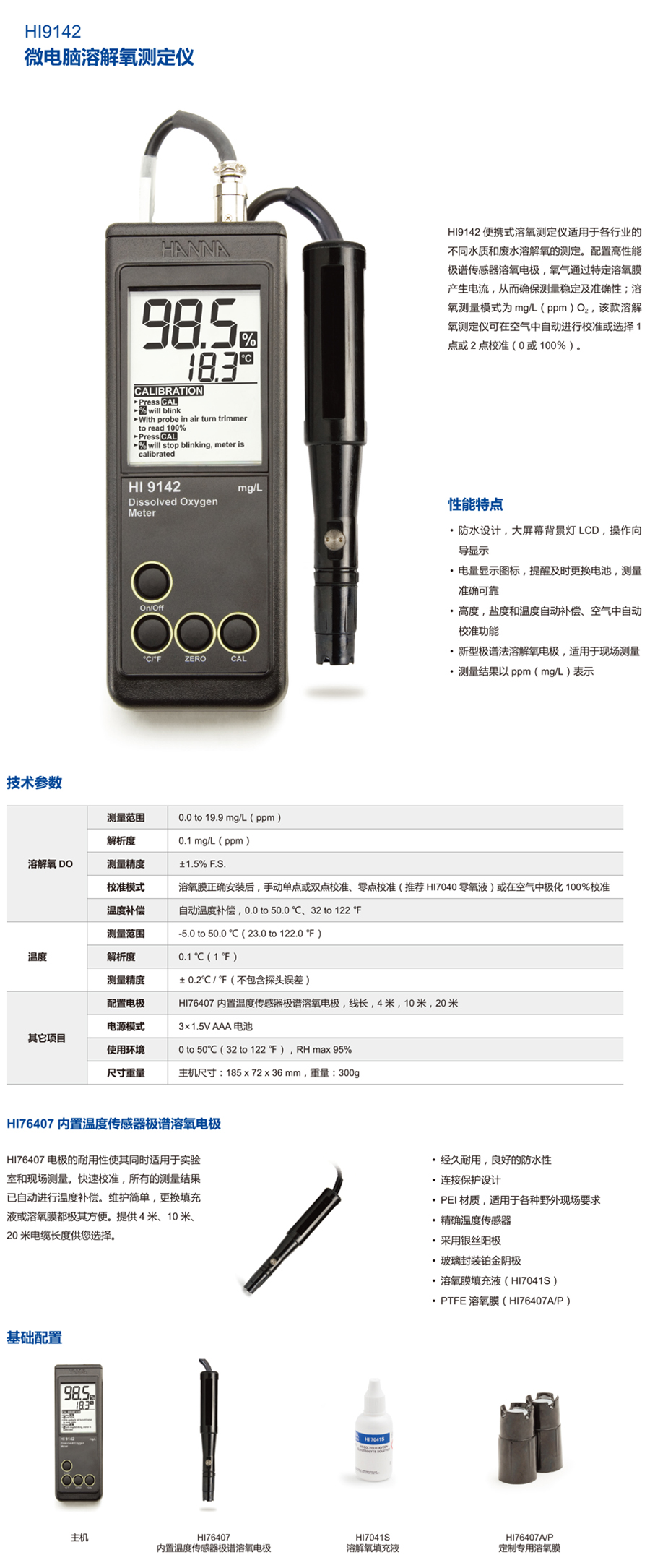 主機(jī),HI76407/4內(nèi)置溫度傳感器極譜溶氧電極,4米線長,HI76407A/P 定制專用溶氧膜,數(shù)量:2個(gè),HI7041S 專用溶氧填充液,規(guī)格:30mL,中英文使用手冊(cè),HI721046定制專用攜帶箱