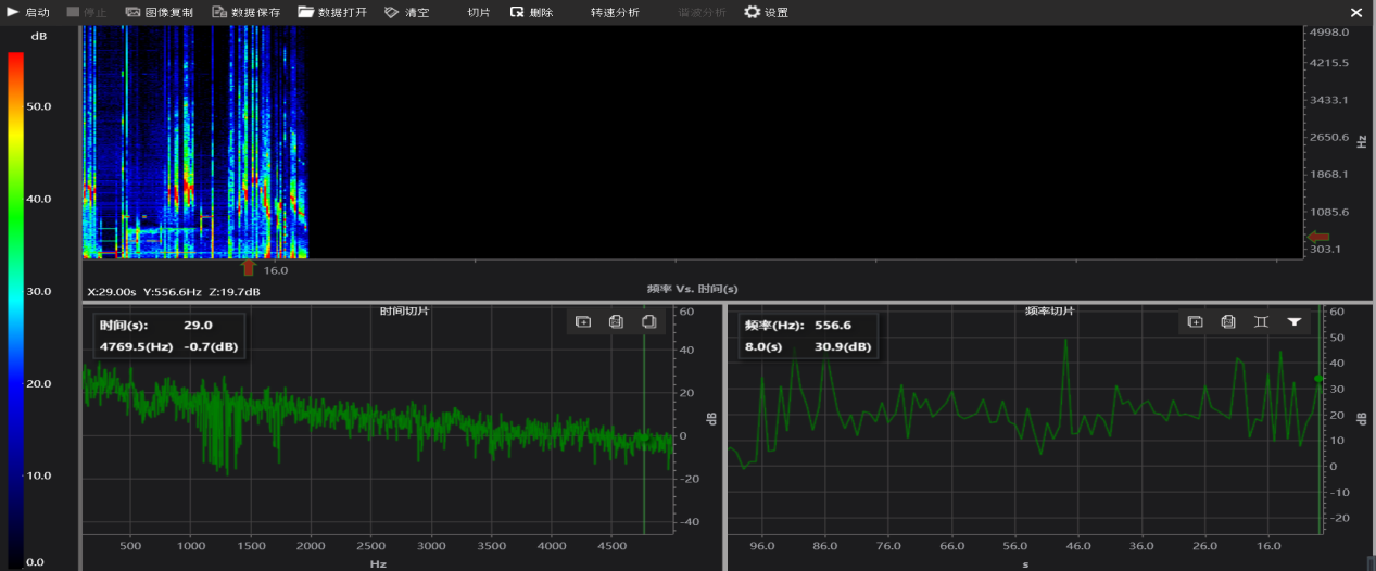 2、用于故障特征點分析診斷用,橫坐標為時間,縱坐標頻率,分貝大小用顏色表示;