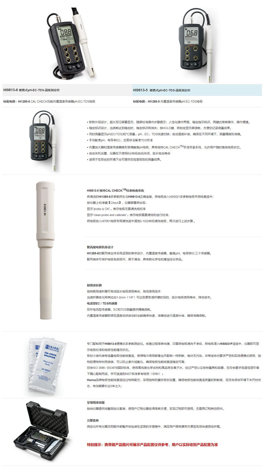 主機,HI1285-6 內(nèi)置溫度傳感器和具有CAL CHECKTM校準核查系統(tǒng)的pH-EC-TDS電極,標準緩沖液套裝(標準值@25°C:7.01 pH、1413 μS/cm、1500ppm,常規(guī)電極清洗液 ,規(guī)格:20mL×4),HI50021定制專用電極性能核查液,規(guī)格:20mL,中英文使用說明書,HI7209811 專用攜帶箱